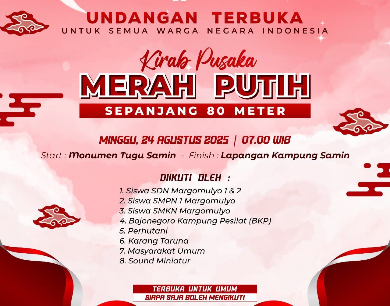 Pada Minggu (24/8/2025), mereka akan menggelar upacara kemerdekaan di depan Monumen Patung Samin Surosentiko, dilanjutkan dengan Kirab Pusaka Merah Putih sepanjang 80 meter.