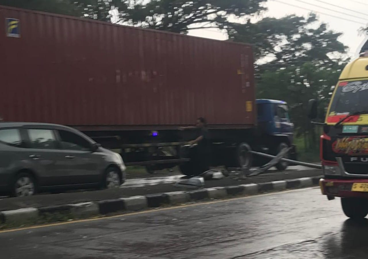 Sebuah mobil box bernopol S 8018 A kehilangan kendali dan menabrak tiang lampu jalan tak jauh dari SPBU Karangtinggil.