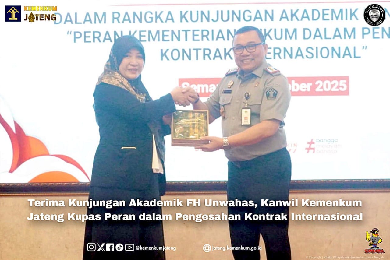 SEMARANG – Aula Kresna Basudewa di Kantor Wilayah Kementerian Hukum dan HAM (Kemenkumham) Jawa Tengah tampak ramai, pasalnya puluhan mahasiswa Fakultas Hukum Universitas Wahid Hasyim (UNWAHAS) Semarang menggelar kunjungan akademik bertema “Peran Kementerian Hukum dalam Pengesahan Kontrak Internasional.” Senin (6/10/2025).