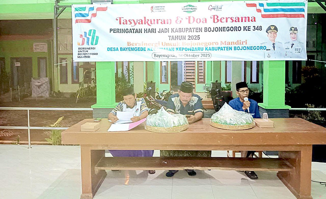 BOJONEGORO – Dalam rangka memperingati Hari Jadi Kabupaten Bojonegoro ke-348 tahun 2025, Pemerintah Desa (Pemdes) Bayemgede, Kecamatan Kepohbaru, menggelar tasyakuran dan doa bersama yang berlangsung khidmat di Balai Desa Bayemgede pada Rabu (22/10/2025).