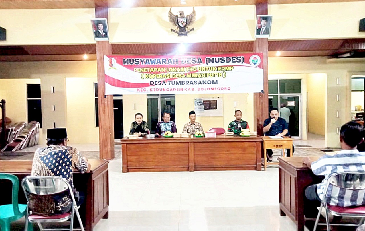 BOJONEGORO — Pemerintah Desa Tumbrasanom, Kecamatan Kedungadem, Kabupaten Bojonegoro resmi menggelar Musyawarah Desa (Musdes) untuk memutuskan lokasi pembangunan gerai Koperasi Desa Merah Putih, Kamis (20/11/2025), di Balai Desa setempat.