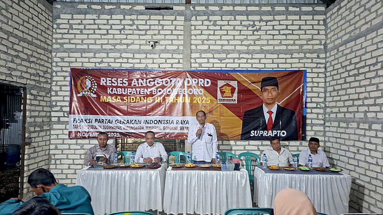 BOJONEGORO — Anggota DPRD Kabupaten Bojonegoro dari Fraksi Partai Gerindra, Suprapto, menggelar kegiatan Reses Masa Sidang III Tahun 2025 di Desa Mojorejo, Kecamatan Kedungadem, Jumat (21/11/2025). Agenda ini merupakan bagian dari kewajiban wakil rakyat dalam menyerap aspirasi masyarakat, khususnya di wilayah Daerah Pemilihan (Dapil) IV.