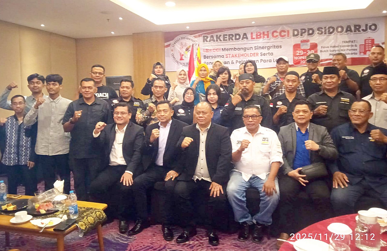 SIDOARJO — Lembaga Bantuan Hukum Cendrawasih Celebes Indonesia (LBH CCI) Dewan Pimpinan Daerah (DPD) Sidoarjo menggelar Rapat Kerja Daerah (Rakerda) pada Sabtu (29/11/2025) di Fave Hotel Sidoarjo. Mengusung tema “LBH CCI Membangun Sinergitas Bersama Stakeholder serta Pendidikan dan Pelatihan Paralegal”, acara ini menjadi momentum penting untuk memperkuat jaringan kerja sekaligus meningkatkan kualitas layanan bantuan hukum di Kabupaten Sidoarjo.