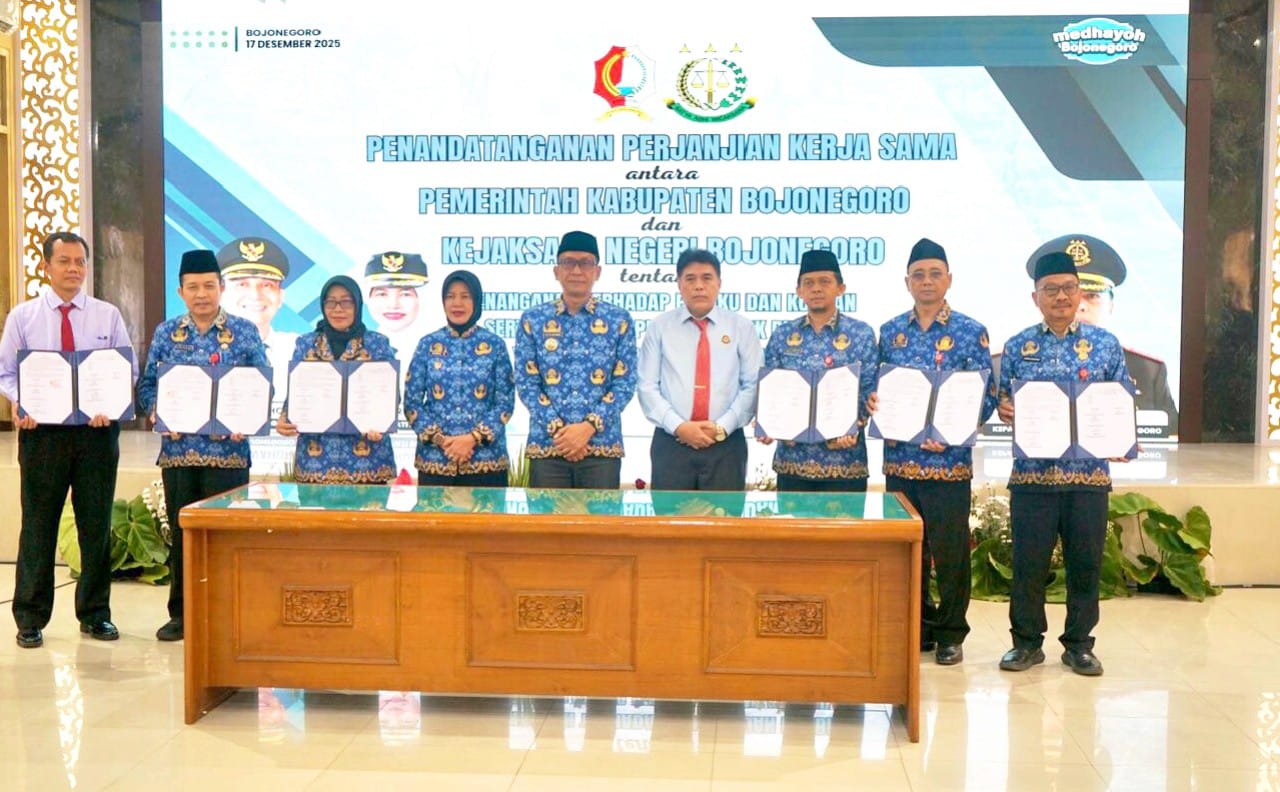 Penandatanganan MoU tersebut digelar di Ruang Angling Dharma Lantai 2 Pemkab Bojonegoro, Rabu (17/12/2025), sebagai langkah konkret membangun sinergi antara pemerintah daerah dan aparat penegak hukum dalam mengawal seluruh program pembangunan.