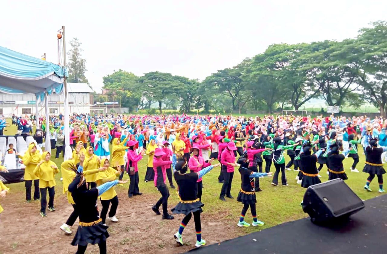 Ratusan warga dan kader PKK tampak tumpah ruah dengan kostum warna-warni penuh kreativitas dalam gelaran Lomba Senam Bahagia, Makmur, Membanggakan (BMM).
