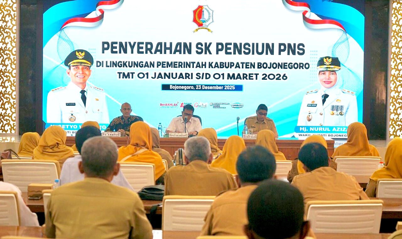 Penyerahan Surat Keputusan (SK) Purnatugas dilaksanakan pada Selasa (23/12/2025) di Ruang Angling Dharma Gedung Pemkab Bojonegoro, dan diserahkan langsung oleh Bupati Bojonegoro Setyo Wahono.