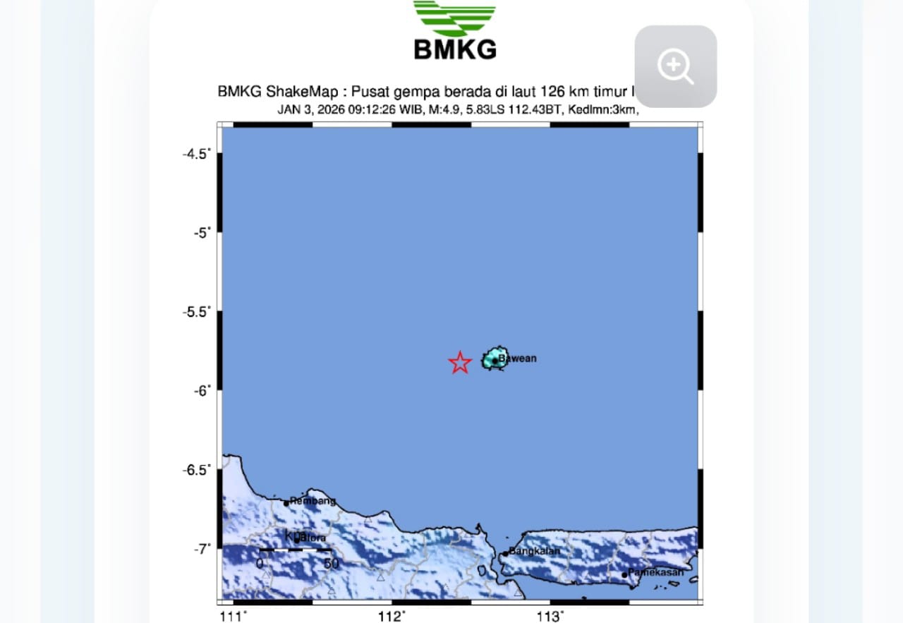 BMKG mencatat, episenter gempa berada di koordinat 5,83 Lintang Selatan dan 112,45 Bujur Timur, tepatnya di laut sejauh sekitar 127 kilometer arah timur laut Tuban, dengan kedalaman 10 kilometer.
