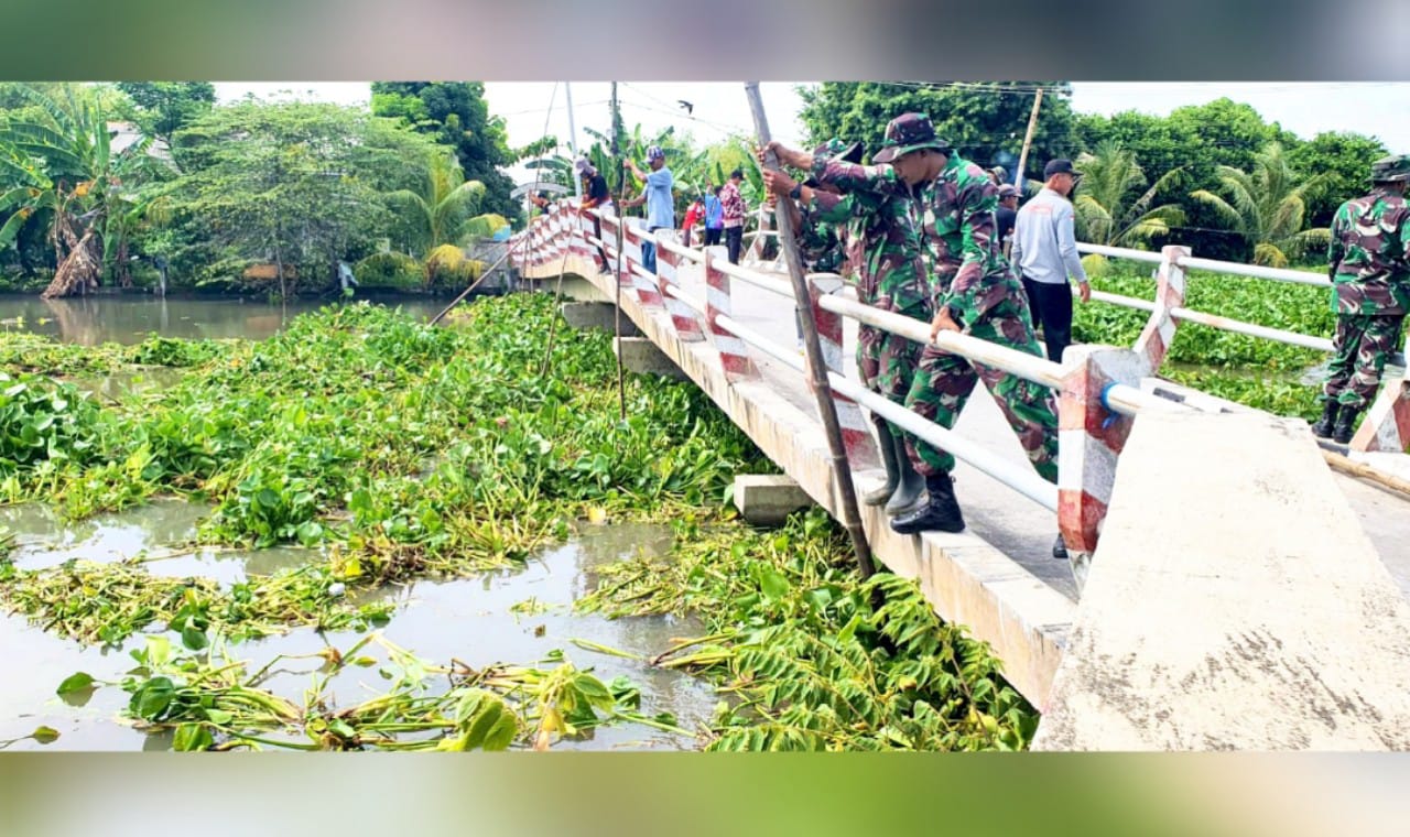 TNI, Polri, BPBD Lamongan, bersama warga dari dua desa turun langsung ke lapangan membersihkan tumpukan enceng gondok yang menyumbat aliran Sungai Bengawan Jeru, Sabtu (10/1/2026).