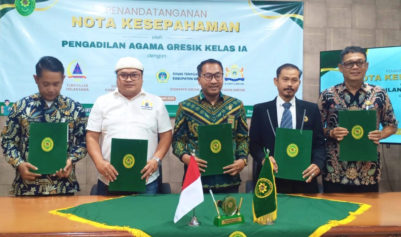 MoU tersebut ditandatangani langsung oleh Ketua PA Kelas IA Gresik Ahmad Zaenal Fanani, Direktur YLBH FT Andi Fajar Yulianto, Kepala Diskominfo Gresik Johar Gunawan, Kepala Disnaker Gresik Zainul Arifin, serta Wakil Ketua Kadin Gresik Nefa Indra Lesmana.