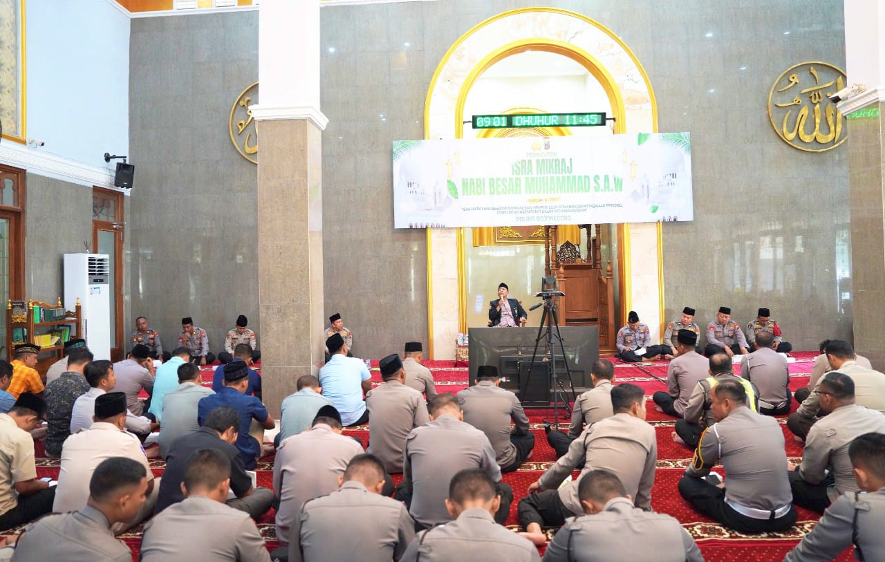BOJONEGORO – Polres Bojonegoro menggelar peringatan Isra Mi’raj Nabi Muhammad SAW 1447 Hijriah/2026 Masehi dengan penuh khidmat di Masjid Al Ikhlas Mapolres Bojonegoro, Kamis (22/1/2026).