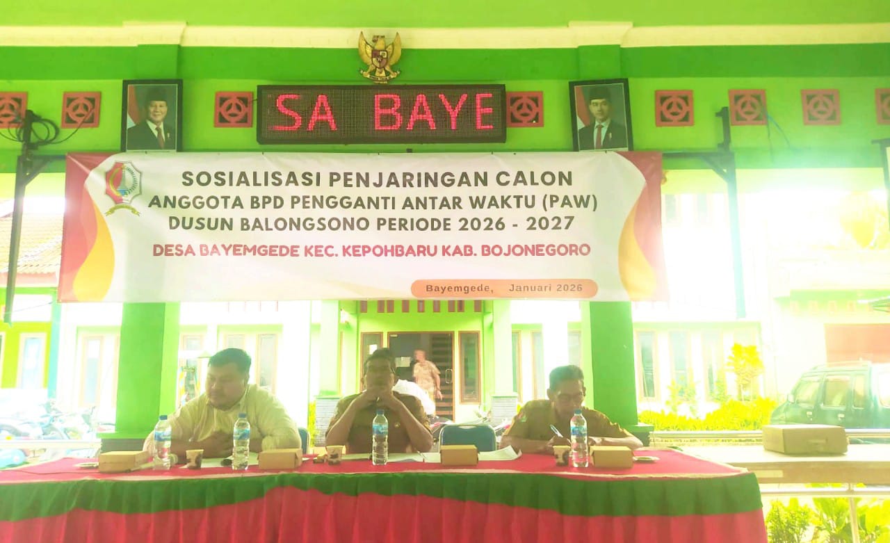 BOJONEGORO – Pemerintah Desa Bayemgede, Kecamatan Kepohbaru, Kabupaten Bojonegoro menggelar sosialisasi penjaringan calon anggota Badan Permusyawaratan Desa (BPD) Pengganti Antar Waktu (PAW) dari Dusun Balongsono untuk periode 2026–2027.