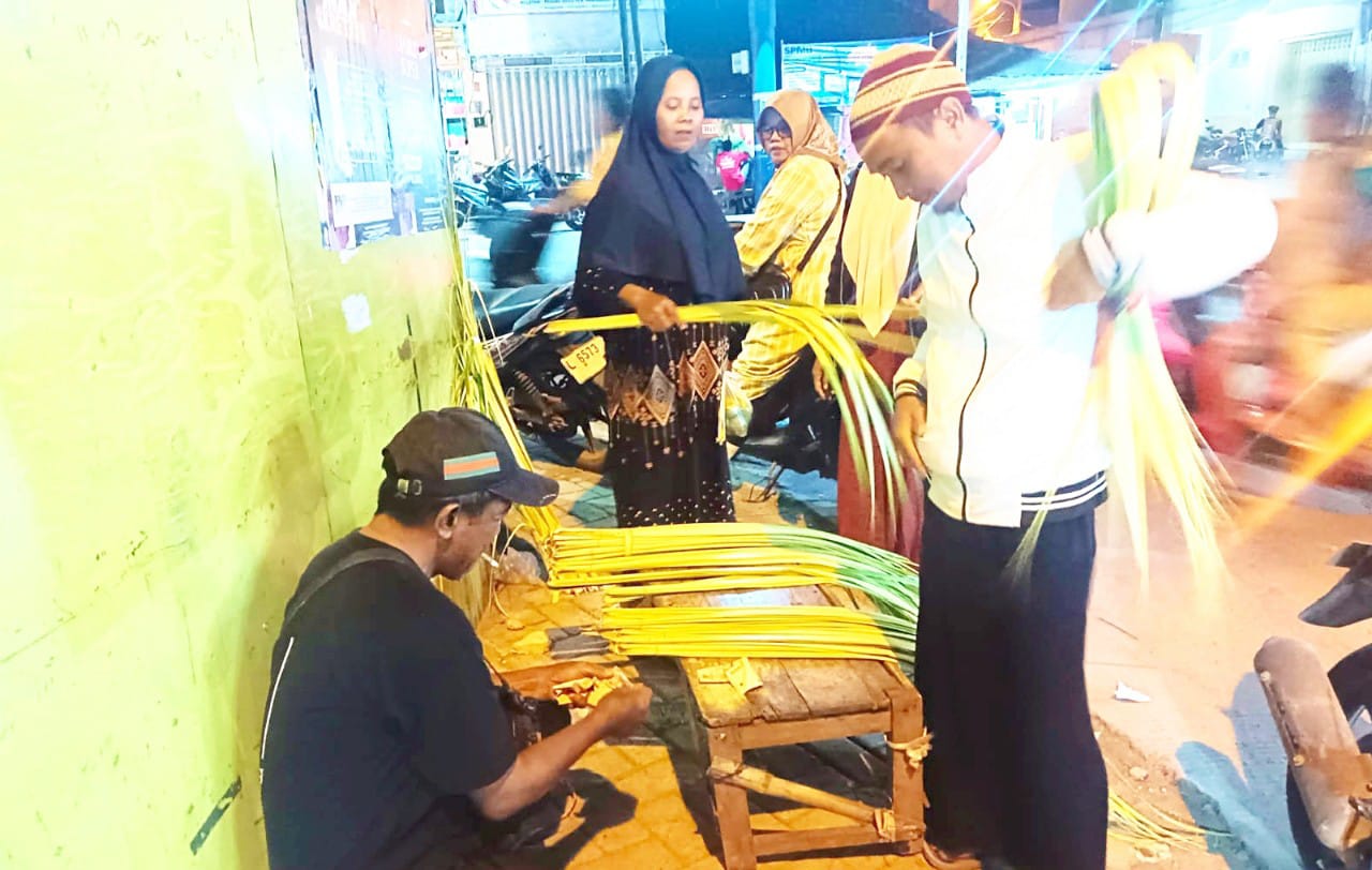 Sejumlah pedagang tampak sibuk melayani pembeli yang berburu janur, hingga ketupat siap pakai untuk kebutuhan ritual doa bersama di mushola dan masjid.