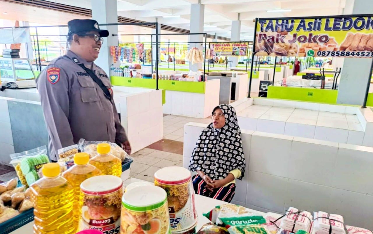 Ps. Kanit Binmas Polsek Kalitidu, Aiptu Sudarto, turun langsung ke Pasar Kalitidu, Bojonegoro, pada Rabu (18/02/2026) guna memastikan stok sembako aman dan harga tetap terkendali.