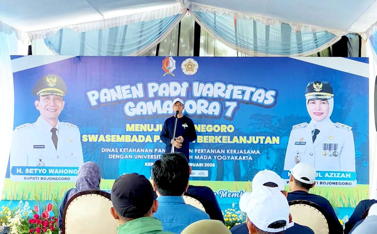 BOJONEGORO – Pemerintah Kabupaten Bojonegoro bersama Universitas Gadjah Mada (UGM) resmi menggelar panen perdana demplot padi varietas unggul Gamagora 7, Sabtu (28/2/2026).