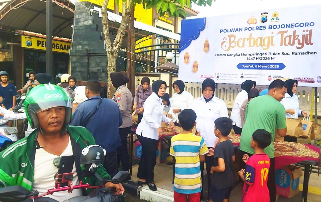 Senyum ramah para Polwan atau Srikandi Polres Bojonegoro menghiasi tepi jalan saat mereka membagikan ratusan paket takjil gratis kepada para pejuang nafkah dan pengendara yang masih terjebak di perjalanan menjelang waktu berbuka.