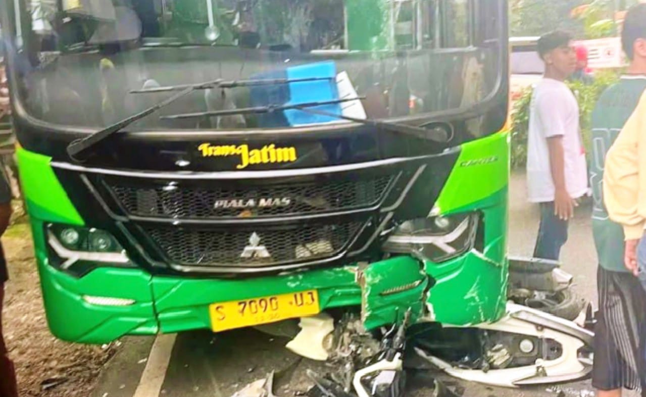 Di saat bersamaan, dari arah berlawanan melaju bus Trans Jatim dengan kecepatan yang tak memungkinkan untuk berhenti mendadak. Tabrakan keras pun tak terhindarkan.