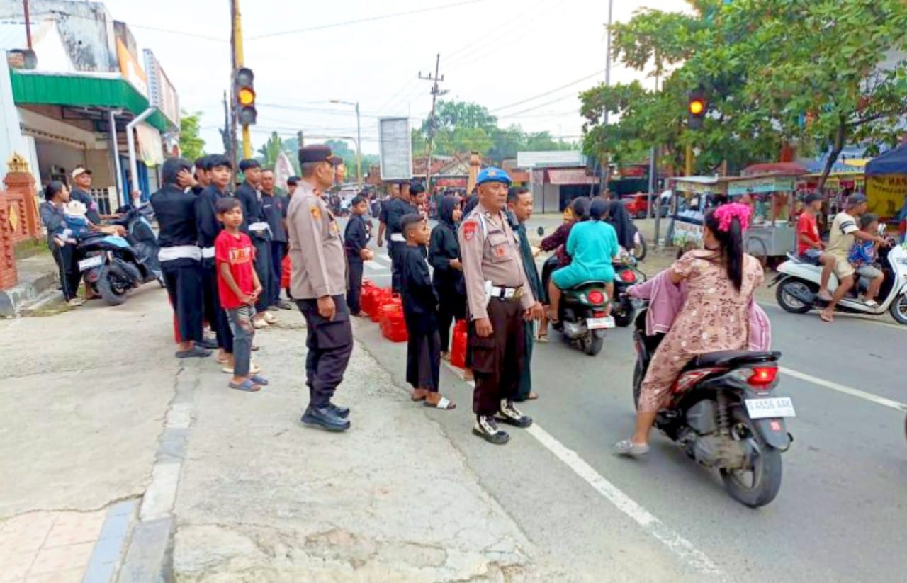 Dipimpin langsung Kapolsek Dander, aparat kepolisian melakukan pengamanan kegiatan pembagian takjil oleh PSHT Rayon Dander, Cabang Bojonegoro, yang berlangsung di pertigaan Pasar Dander, Kamis (19/3/2026).