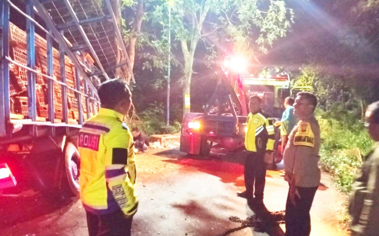 Sebuah truk bermuatan ayam potong mengalami kecelakaan tunggal setelah menabrak pohon di tepi jalan.