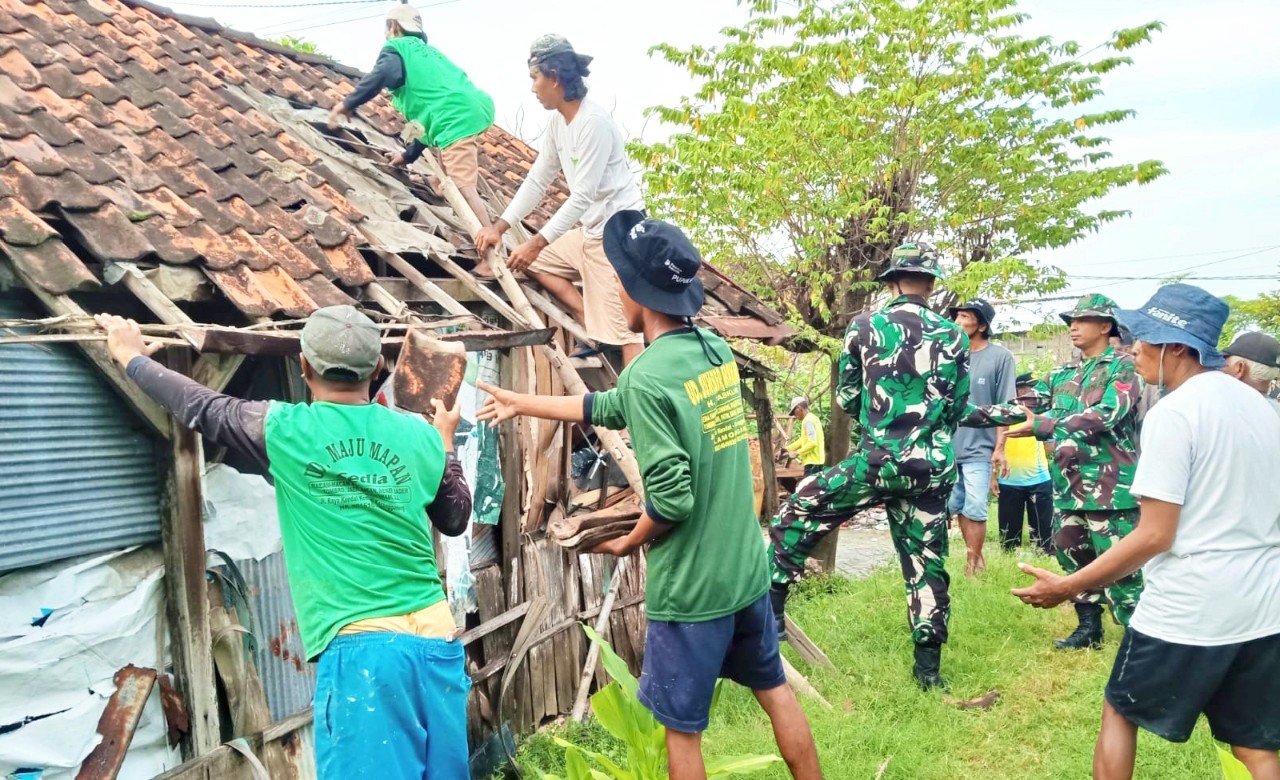 Warga bersama aparat TNI terlihat kompak menurunkan genteng, mengangkat material kayu, hingga membersihkan puing bangunan.